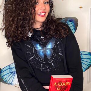 With this blue butterfly set against a cosmic background of stars and galaxies, this design is all about growth and self-discovery.